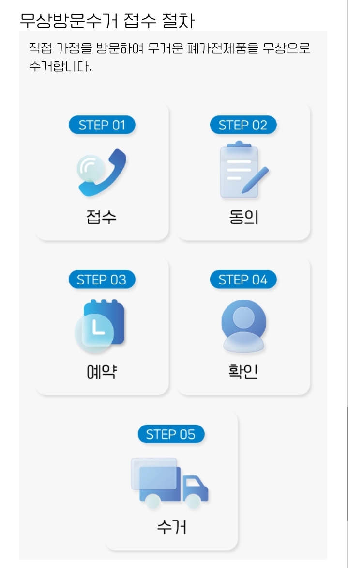 집에서 사용하지 않는 대형·소형 가전제품을 지자체와 환경부에서 무료로 수거해 재활용하는 서비스입니다.